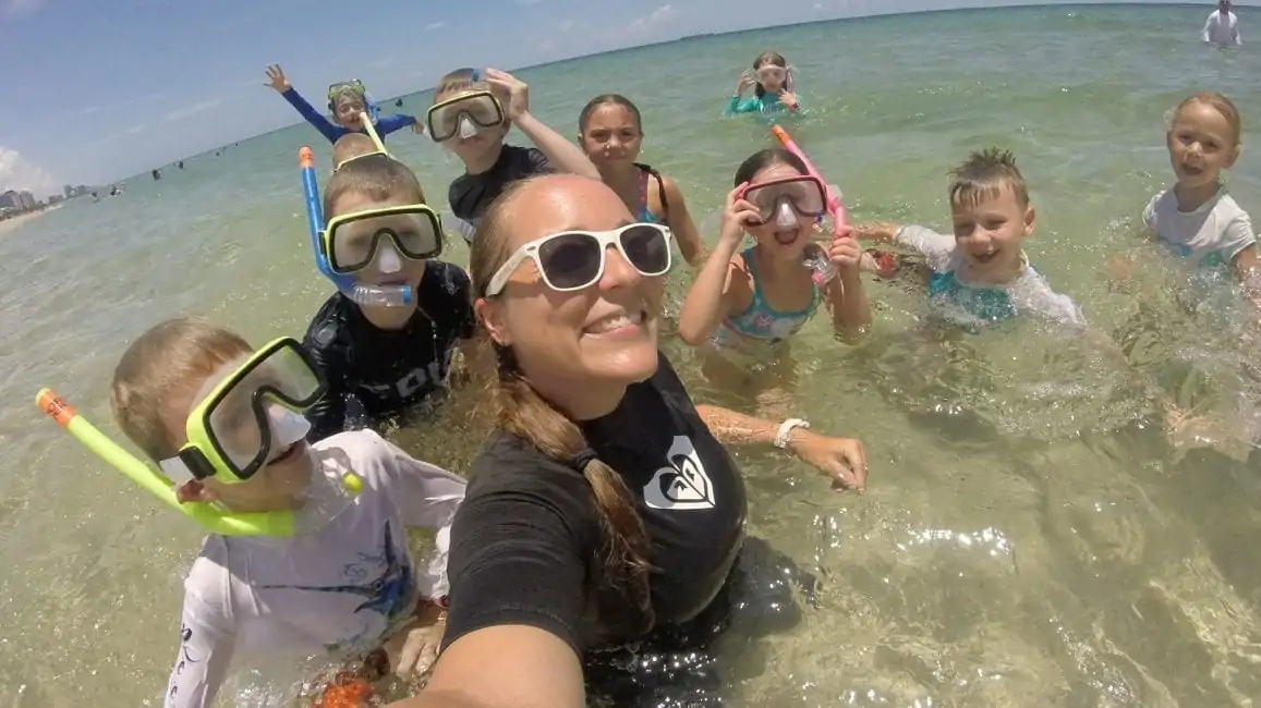 The connections starts with introductions as the kids share their favorite creature in the ocean. Each child then creates their own unique tie-dye shirt. After that, it’s off to the pool for professional snorkeling lessons with CPR certified instructors. The pizza picnic at lunch is loaded with Quizology and Funky Fish Factoids. Then, it’s off to the shallow ocean to look for fish and shells, skim board, or boogie board. An amazing day finishes with a grand tie-dye opening celebration!